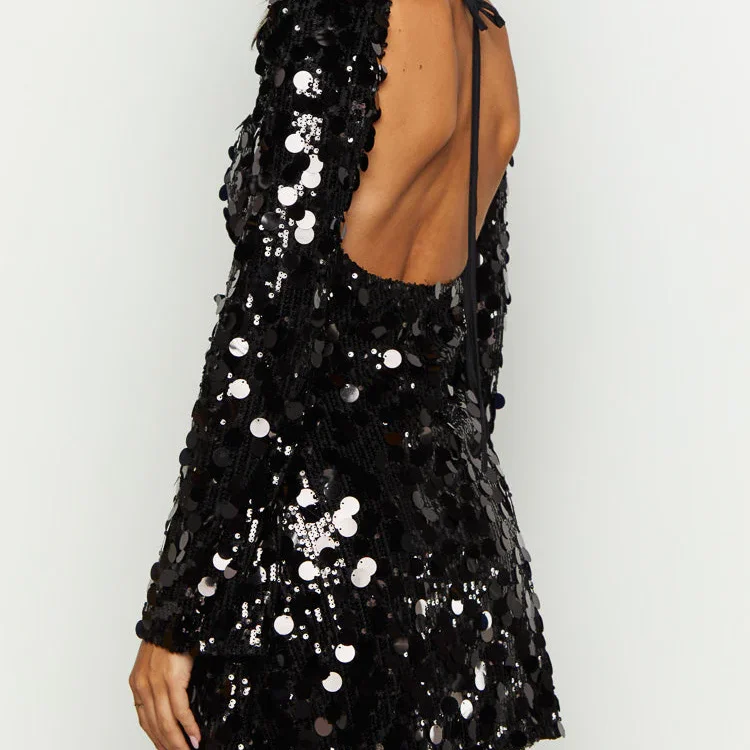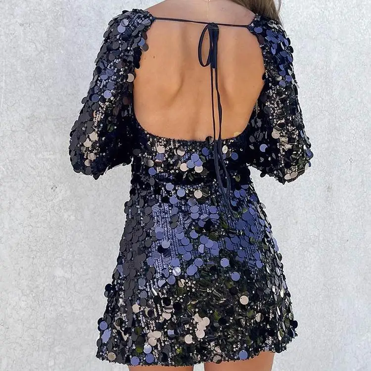 Black Sequin Ball Gown Dress New Style Decorated Natural Waistline Mini Sleeves Breathable Washable Solid Fashion